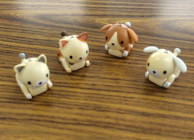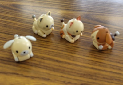 耳の立った子猫2匹と耳の垂れた子犬2匹 耳と足が動いて、かわいい声で鳴いたり、何かをしゃべったりしているようですが、・・・ LR44電池を2個ずつ使用しているおもちゃです 電池が減っているのと、電極が錆びているのが原因で、錆び落としと電池交換で動くようになった |
